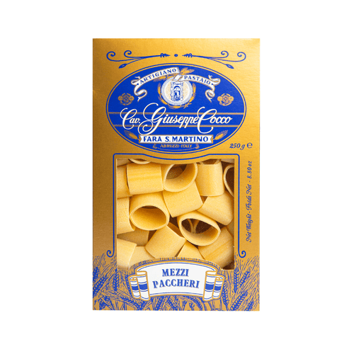 Since the shape of paccheri pasta is so well-suited to holding other ingredients, they are often filled with ricotta cheese or hearty Bolognese sauces. (Of course, garlic pasta sauce is a favorite, too.) This type of pasta begs to be served with Italian meat, especially Italian sausage. In addition to Italian meat, seafood is also a common ingredient in paccheri dishes. Paccheri also makes for great baked pasta recipes.