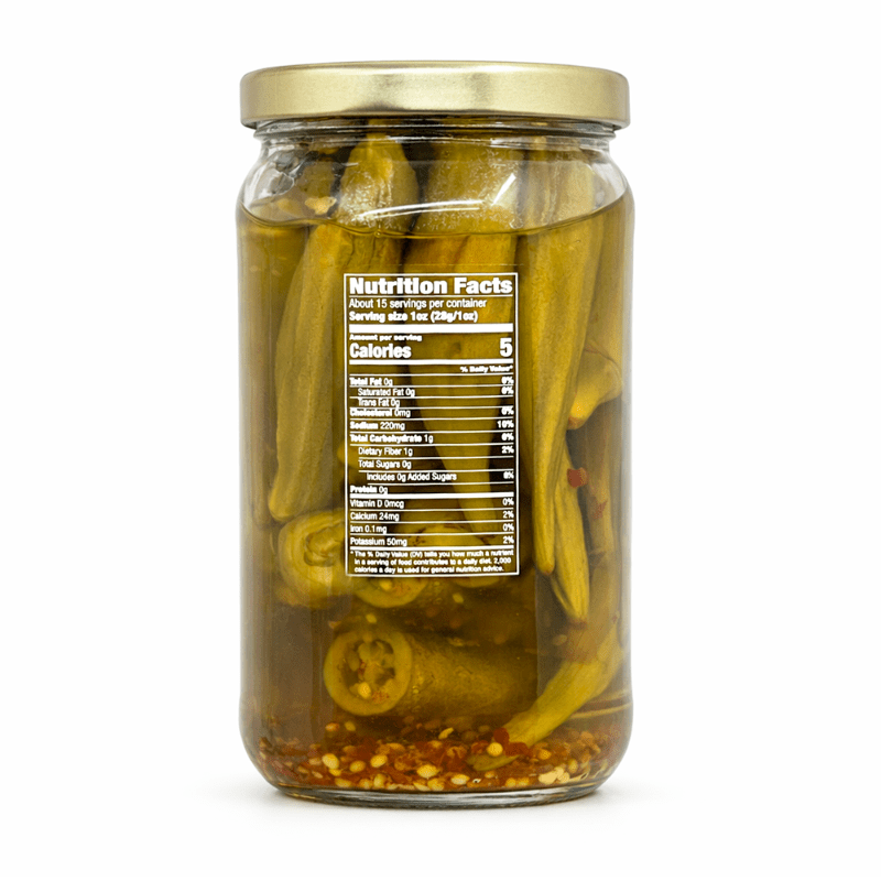Fresh okra, water, vinegar, salt, natural flavors and spices, calcium chloride, FD&C yellow #5, mustard seed, crushed red pepper.