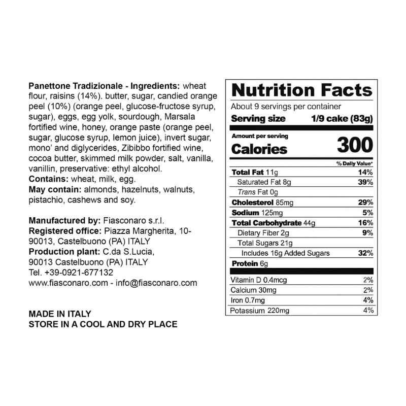 Wheat flour, raisins, butter, candied peel from fresh oranges, sugar, fresh eggs & egg yolk, natural yeast, Marsala, Sicilian honey, inverted sugar, orange puree, Zibibbo wine, cocoa butter, powdered skim milk, salt, natural flavors, vanilla. (Emulsifying agent: mono-diglycerides of fatty acids)